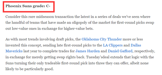 北京时间1月22日,太阳和爵士完成一笔选秀权的交易,目前已经官宣完成。太阳送出2031年无保护首轮,换来爵士的三个首轮签。这三个首轮分别是2025年骑士与森林狼的顺位最靠后的一个,2027年骑士、森林狼和爵士的顺位最靠后的一个,2029年骑士、森林狼和爵士的顺位最靠后的一个。随后ESPN对这笔交易进行评级,太阳被看衰,只评了C-,而爵士评A-,明显占优。