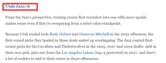 从爵士角度来看,将多余的首轮签变成具有更有上升空间的首轮签是有意义的,即使从严格的价值角度来看他们支付过多。